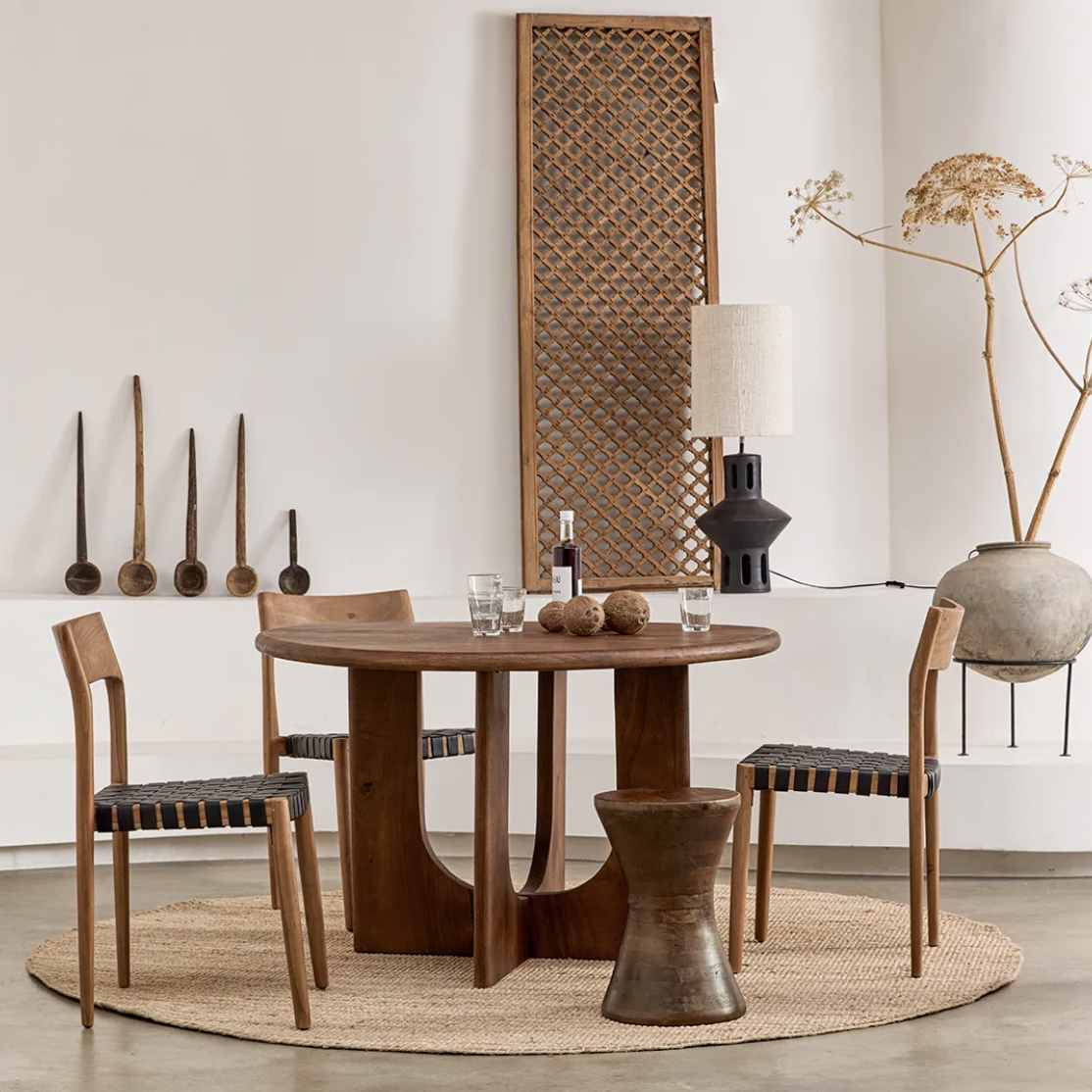 The modern KIM dining table is made of mango wood. The shape of the table is round, with a cross base. This table is available in 1 size: 120 cms.